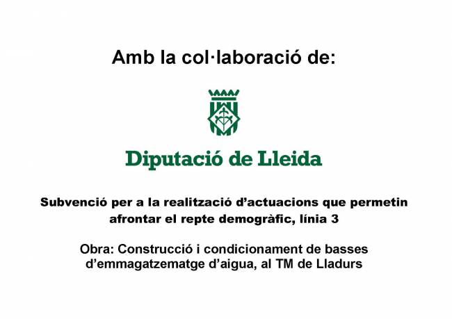 Gràcies a aquesta subvenció s'ha pogut finançar les obres de construcció i condicionament de basses d'emmagatzematge d'aigua, al TM de Lladurs